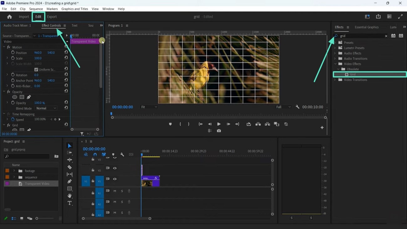 - Step 3. Now, access the "Edit" tab and enter the "Effect Controls" section to unveil an Effects section on the right. Here, search for "Grid," and the effect will be automatically applied to the video.