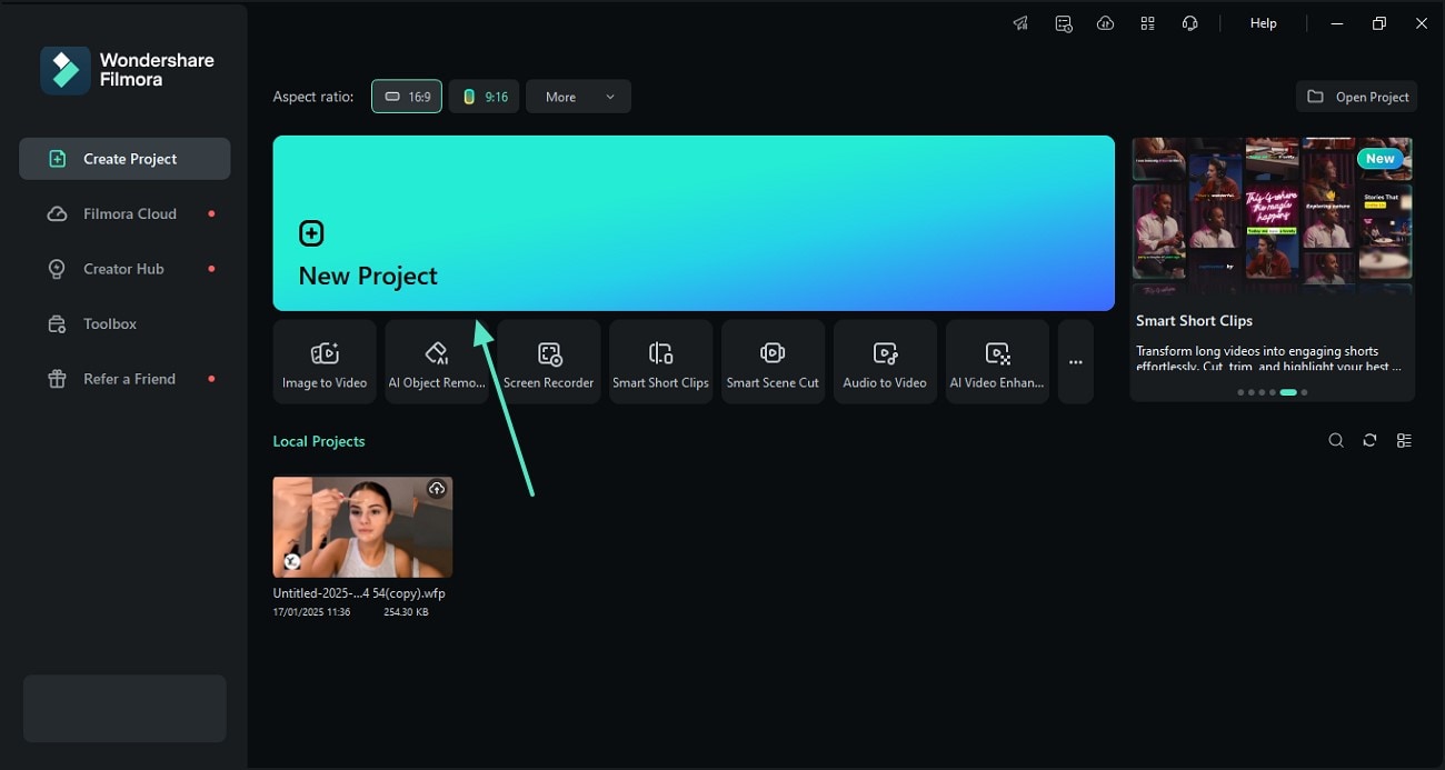 - Step 1. Import a Video to Start the Process. To start, open Filmora on your desktop and select the "New Project" button to "Import" a video from your device.
