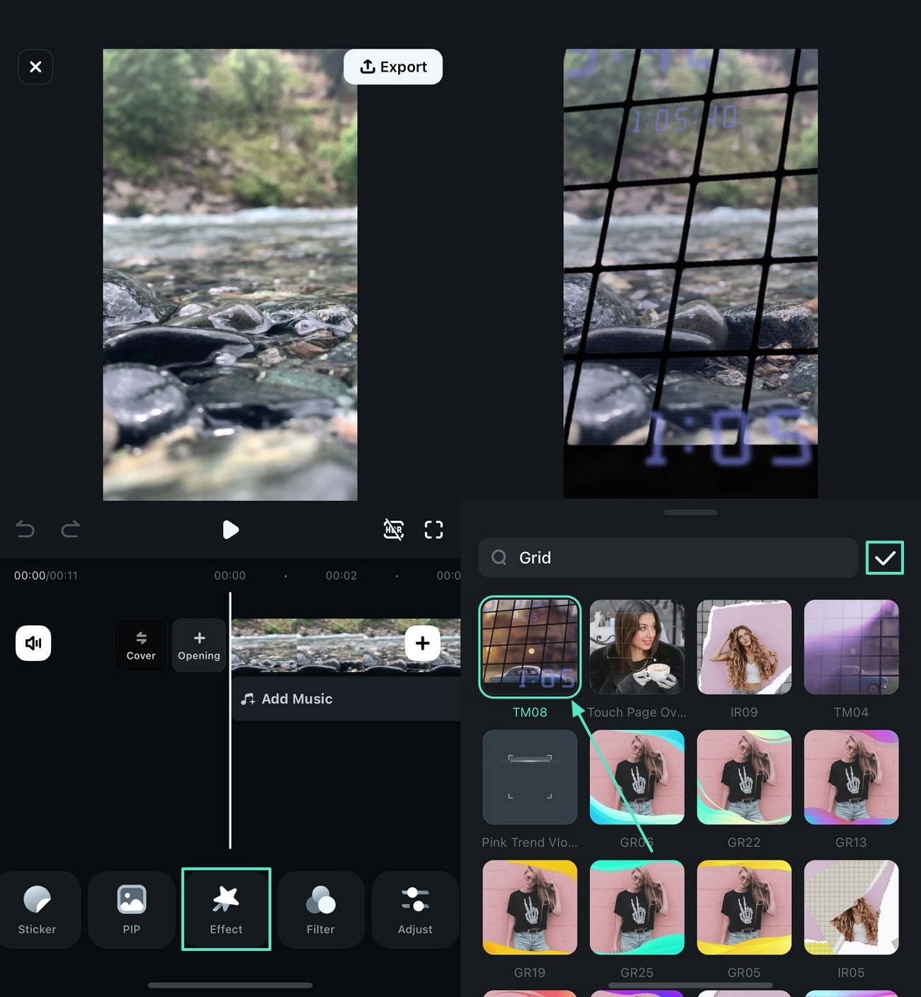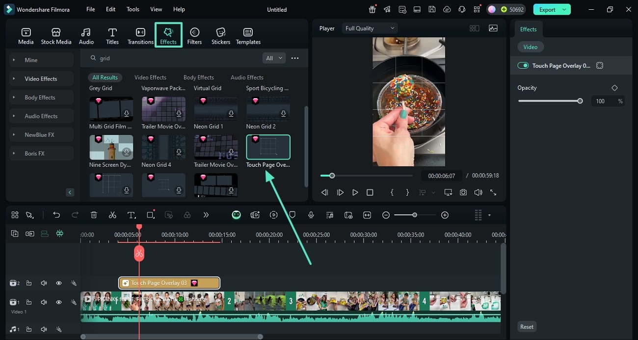 - Step 2. Apply a Grid Effect from the Effects Tab. Upon dropping the video into the timeline, access the "Effects" tab from the top toolbar and search "Grid" to apply your favorite effect. This effect can be customized manually using the right panel.
