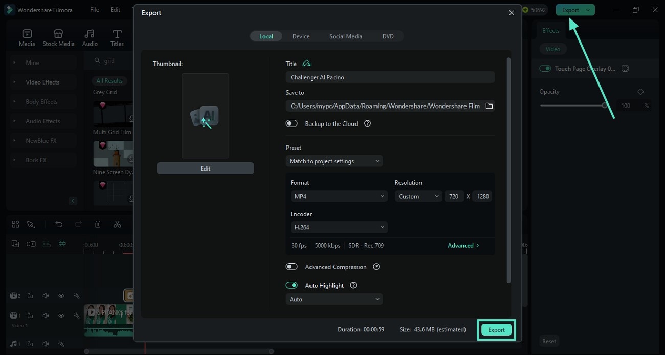 - Step 3. Export the Grid Effect Video to the Device. Once you are done editing, access the "Export" button from the top right corner and export the video using the next window.