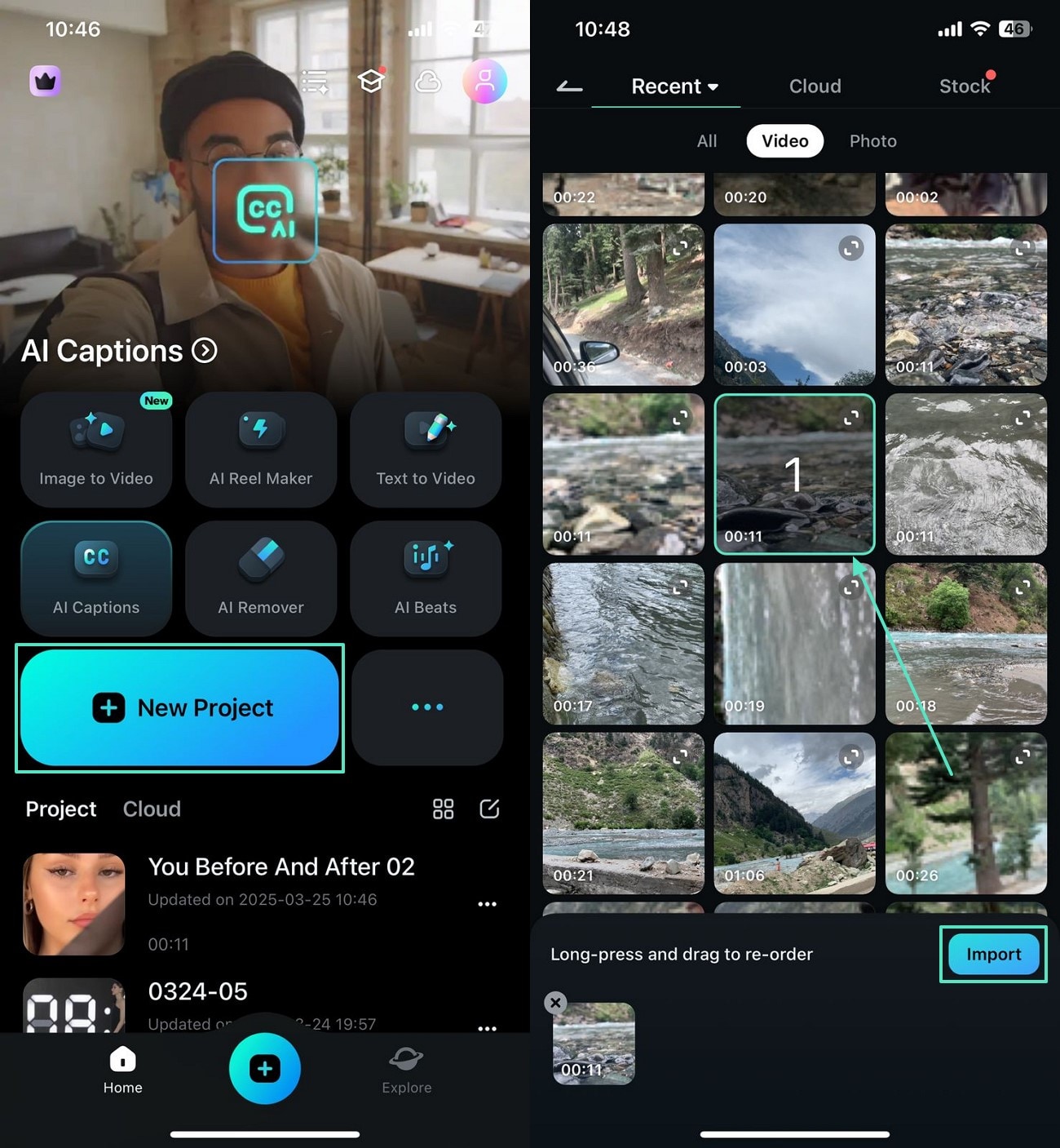 - Step 1. Enter a New Project and Import a Video. First, open the main interface of the Filmora App and tap "New Project" to "Import" a video from the device.