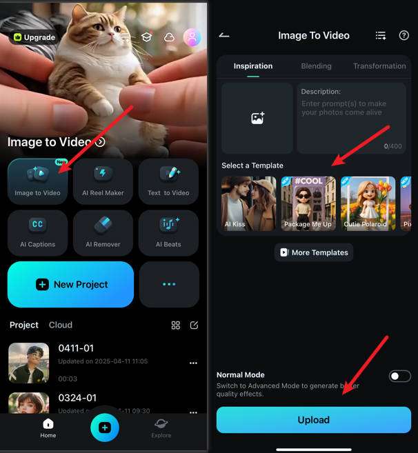 - Click on Image to video > Select the Package Me Up template > Upload a reference image.