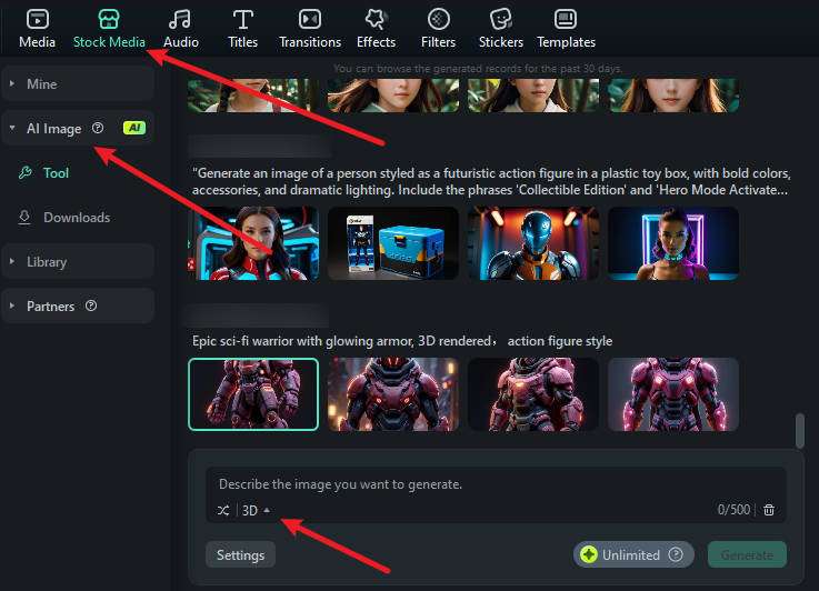 - Open the AI Image: Inside Filmora, go to the Stock Media > AI image generator section.