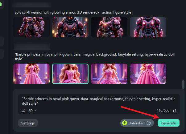 For those without a reference photo, Filmora's AI Text-to-Image Generator is the perfect alternative. This feature allows users to type in a creative prompt and generate a visual representation that looks like a professional digital painting or 3D render. It's ideal for fantasy characters, futuristic warriors, or stylized dolls—all central to the current AI doll trend.