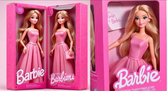 2. "Barbie-style fashion doll inside a pink toy box, plastic window, labeled packaging, perfect makeup, pink dress, long blonde hair, 3D render".
