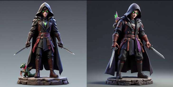 4. "A sleek fantasy rogue action figure with a dark cloak, leather armor, twin daggers, and glowing green eyes. Comes with a tiny magical companion (like a mini dragon). The figure stands on a stone-like base with embossed runes."