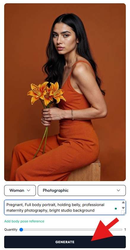 Here's the prompt we used: A woman with long, wavy black hair and a calm, confident expression, sitting on a wooden box against a warm orange background. She is wearing a fitted, sleeveless burnt orange jumpsuit and holding a bouquet of orange lilies. She is pregnant and has a visible baby bump, naturally rounded to reflect her pregnancy, with her hand resting gently on her belly.