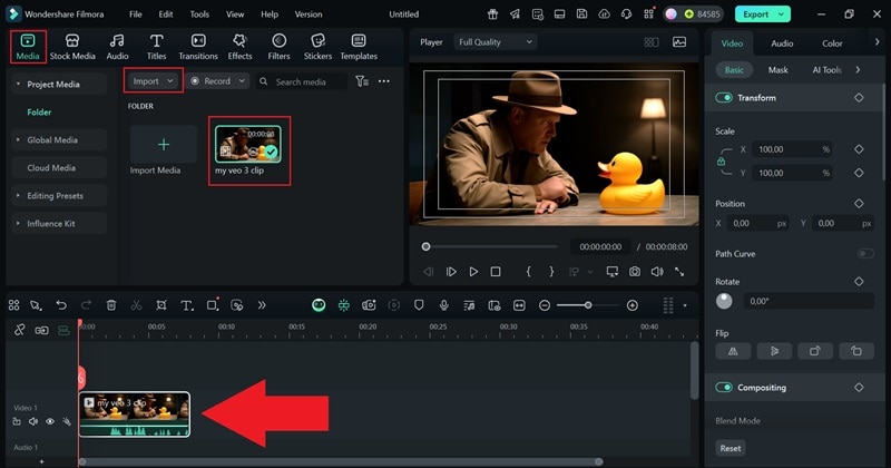 Next, open the latest version of Filmora and start a new project. Go to the "Media" tab, click "Import" to upload your Veo 3 AI video, then drag the clip onto the timeline to start editing.