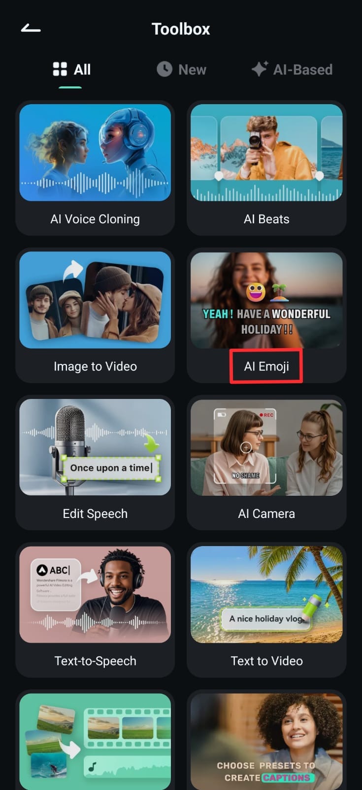 - Step 1. Download the Filmora app from the official app store (Google Play Store or Apple App Store). Open the app and tap the three-dot menu (...) to access advanced tools. Navigate to the AI Emoji tool within the Filmora toolbox.