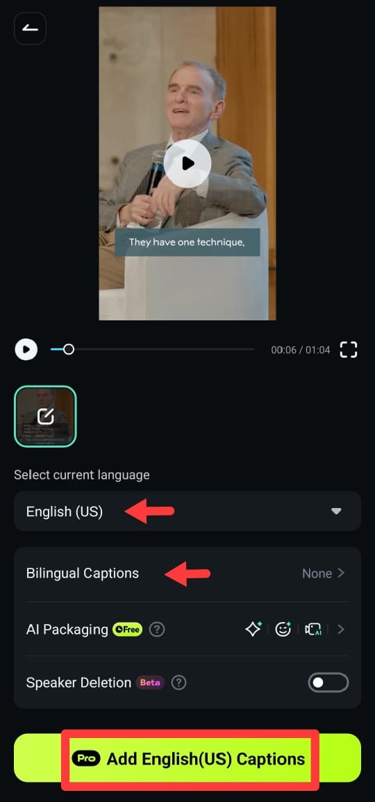 - Step 3. Auto Identity detects the video’s audio language automatically but you can change it to your preferred language. If you want video subtitles/captions in two languages, click Bilingual Captions and choose the desired language. Enable the preferred options in AI packaging.