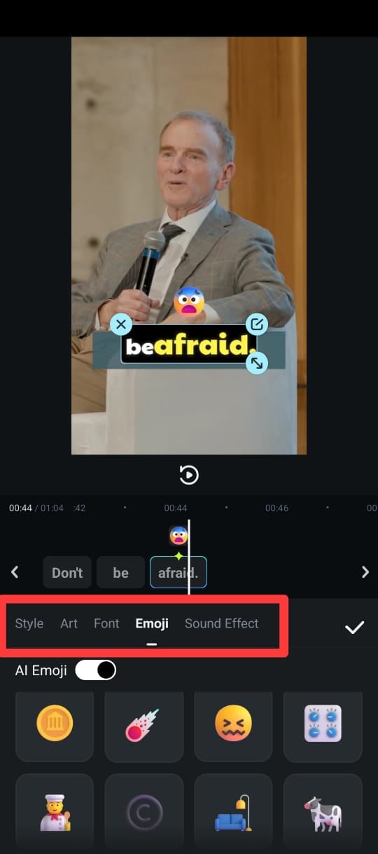 Apart from the AI Emoji tool, you can also choose animated emojis for your video content from the emoji section of the Sticker tab while editing videos.