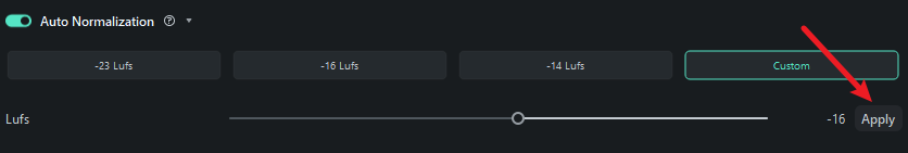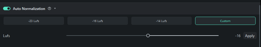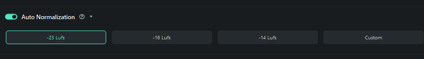 The Auto Normalization feature analyzes the loudness of selected audio clips and adjusts them to meet different platform standards (LUFS/LKFS). This ensures your content complies with broadcasting requirements whether you're publishing to YouTube, streaming services, or traditional broadcast platforms. You can choose from preset options or set custom loudness values.