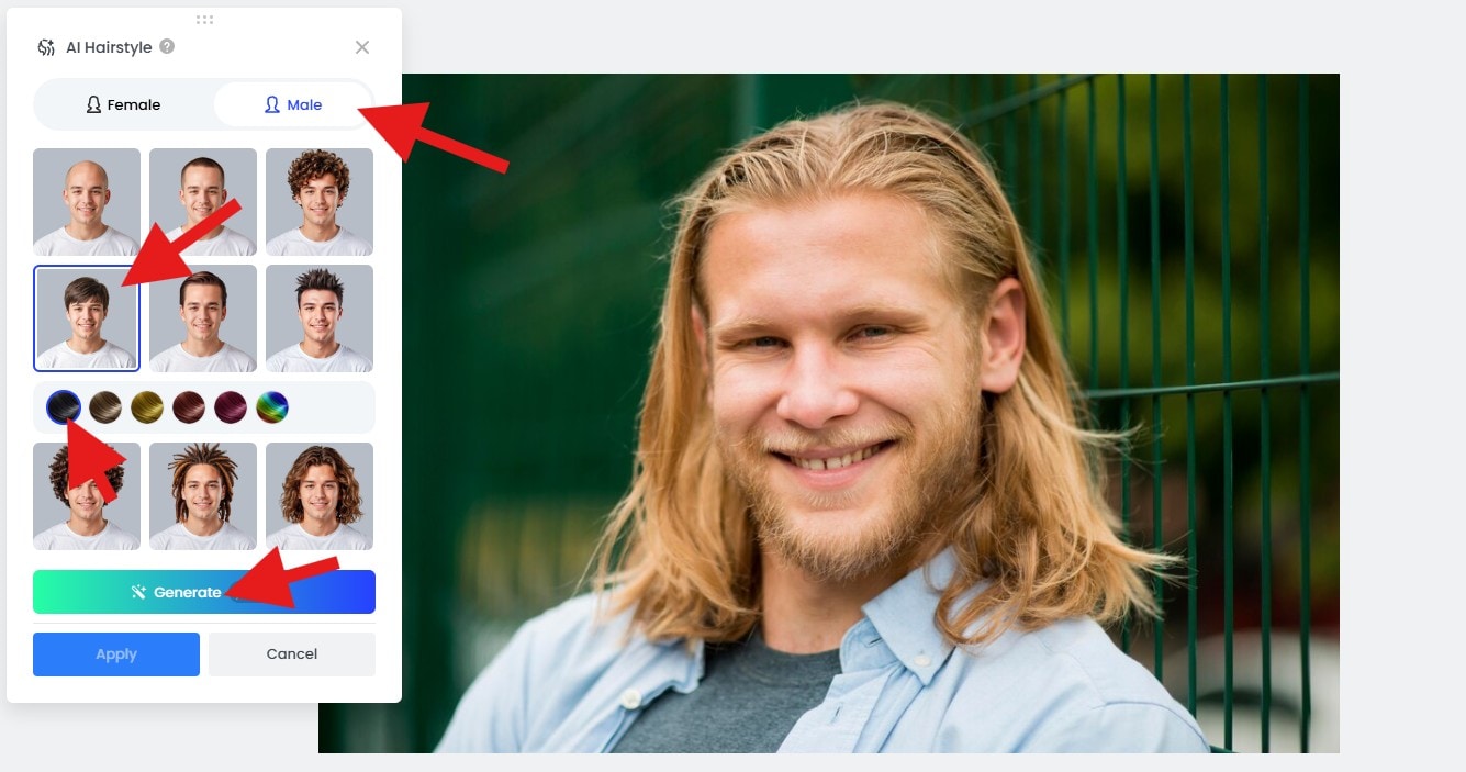 Step 3: Select the Male category, pick a hairstyle, pick a hair color, and click on Generate.