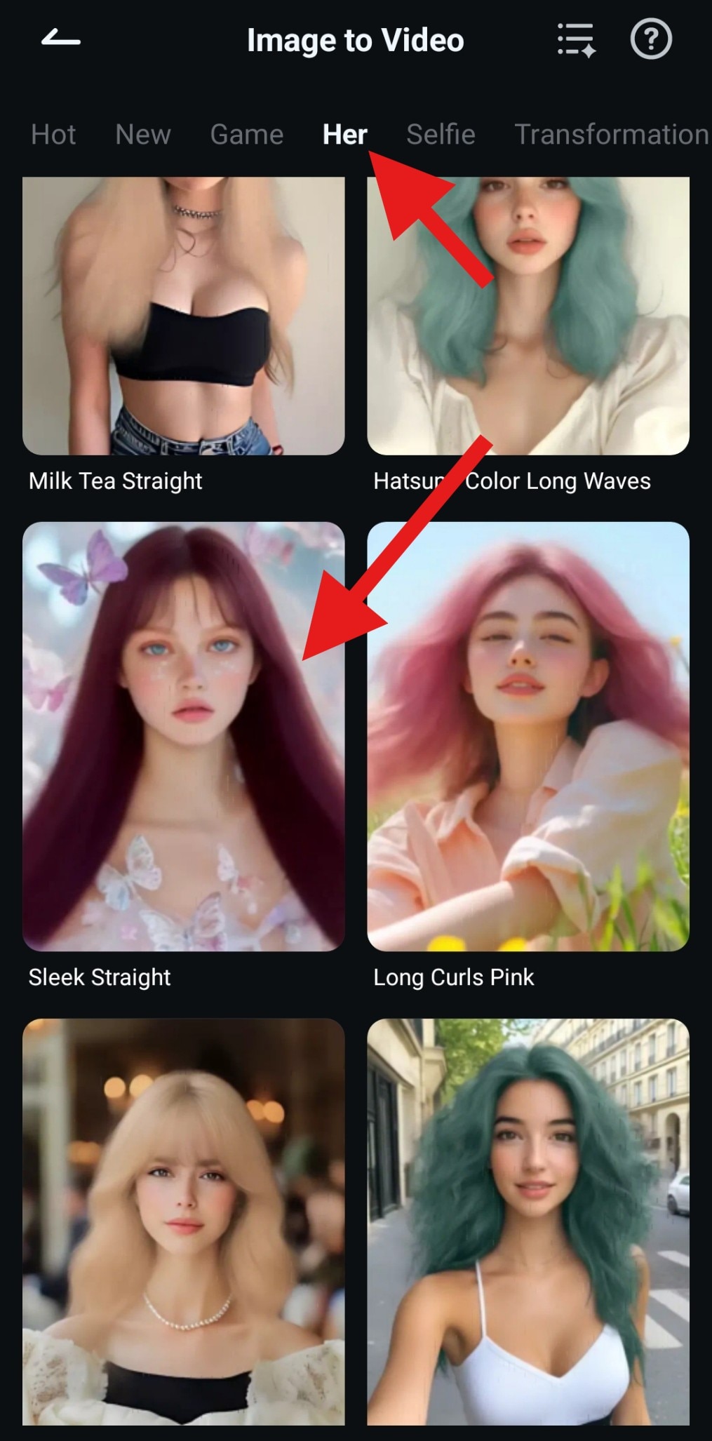 Step 5: Find the Her section. Here, you'll see several templates featuring hair transformation. For this tutorial, we will choose the Sleek Straight template.