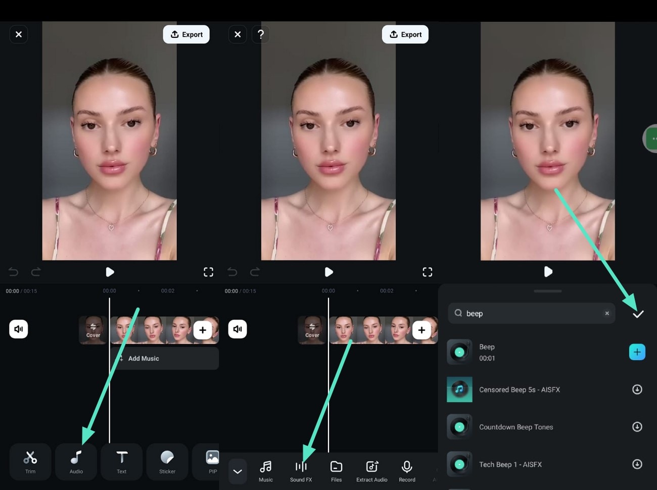 - Step 2. Add a Beep Sound Effect from the Audio Option. Moving forward, tap on the "Audio" option from the bottom bar and hit the "Sound FX" function. Navigate to the next screen, press on your desired sound, and tap on the "Tick" icon to execute the bleep video effect process. Moreover, you can do this by right-clicking on the video clip you placed on the timeline and selecting the Detach Audio option or by using the CTRL+ALT+D keyboard shortcut on PC and Control-Option-D shortcut on Mac.