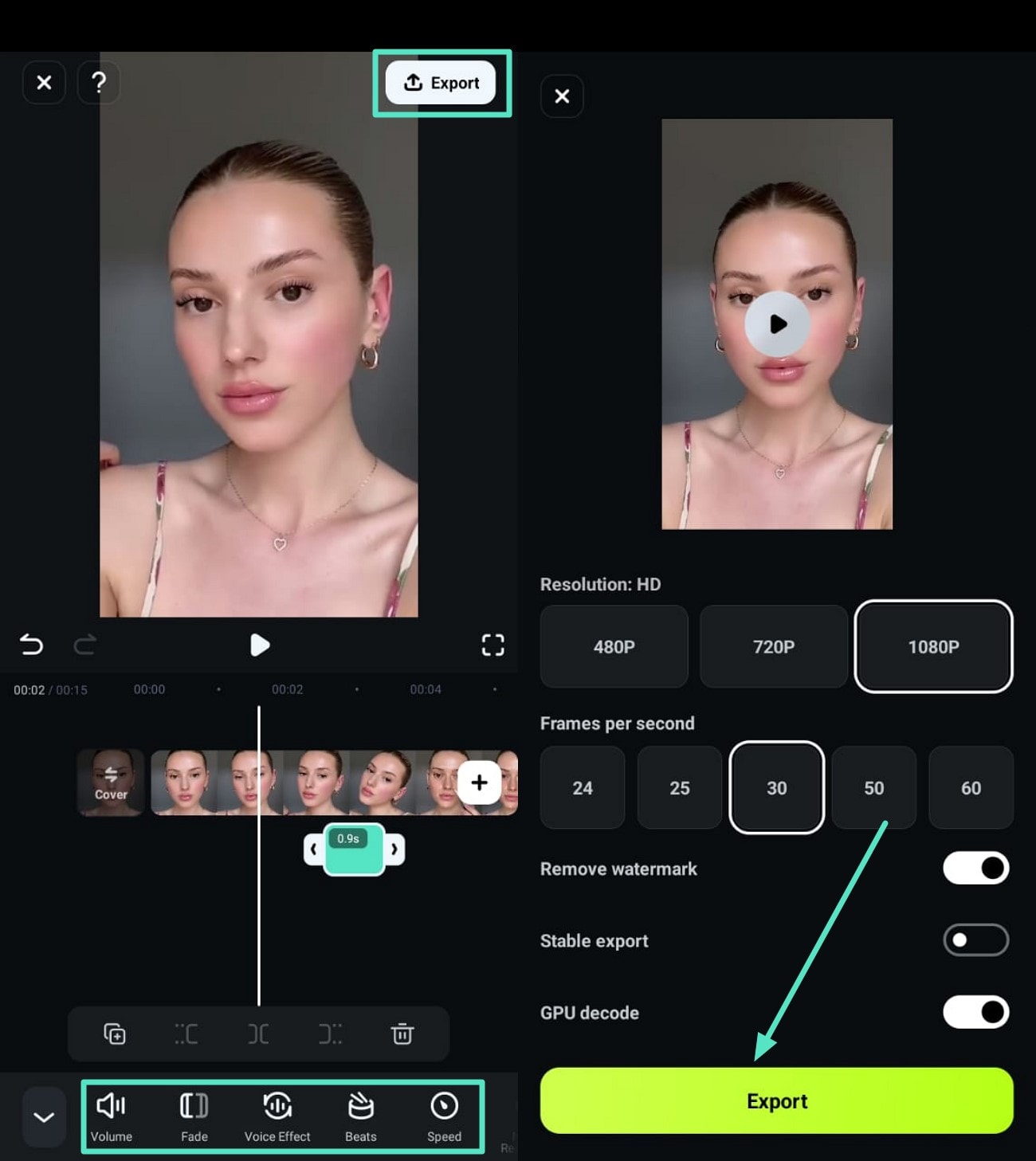 - Step 3. Adjust Beep in the Video and Export. Afterward, configure the beep video effect in the timeline and enhance the audio quality, like speed and noise reduction of the audio. In the following display, you can add "Beats" to your video. In the final step, configure the resolution and frame options as per your needs. Moving forward, hit the "Export" button to save outcomes on your mobile.
