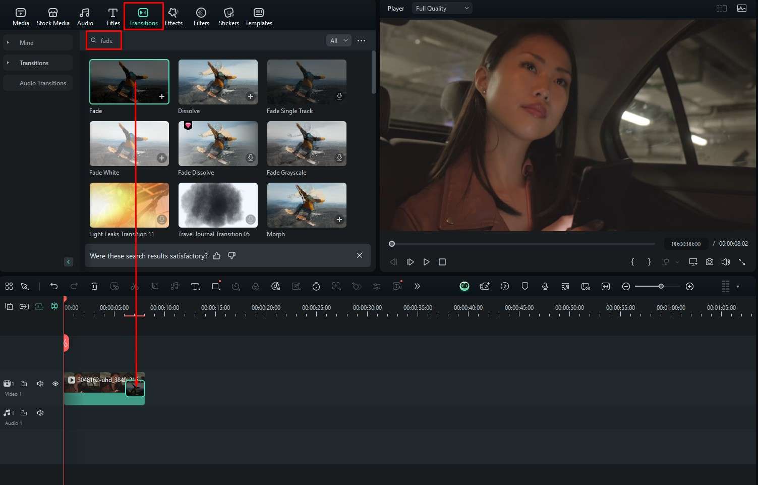 Step 4: Go to Transitions, search for “fade” and drag the Fade transition effect to the end of your video clip.